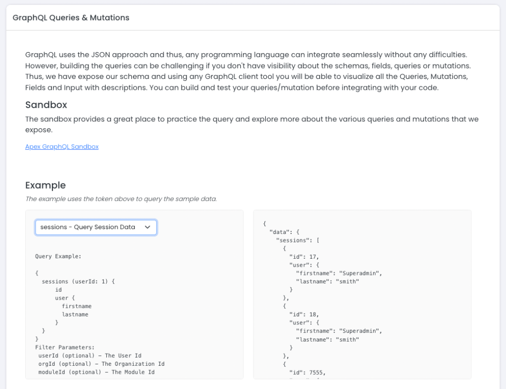 - Allows customers to connect their 3rd party analytics engines to platform data or for integration of LMS